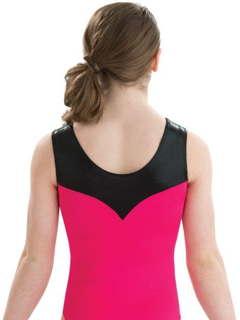 • Striking scoop back girl's tank leotard in lipstick nylon/spandex showcases a black mystique top with a unique white sparkle hologram and silver hologram sequinz™ swirl design on the front.