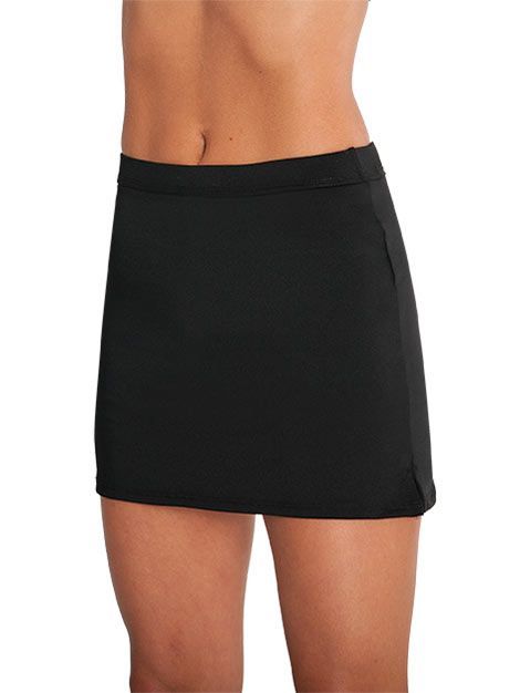 • School fit regular rise basic skirt in solid drytech features attached boycut brief and elastic waist.