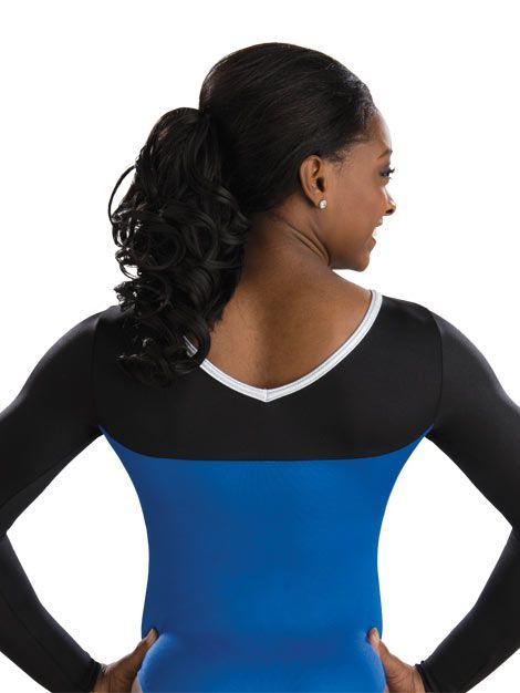 • Elegant v-neck long sleeve gymnastics leotard with modified leg cut in black and royal nylon/spandex features cascading bodice design lines in white sparkle hologram and a touch of clear Swarovski® crystals.